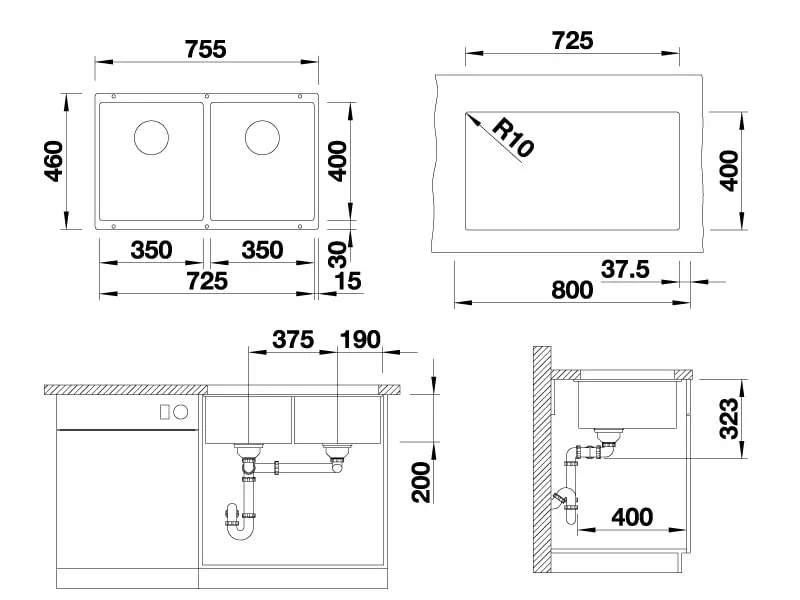 Blanco Subline 350/350 jest wykonana z materiału SILGRANIT® PuraDur®. Wyróżnia się wysoką jakością i trwałością, trwałością kolorów i przyjemnie gładką powierzchnią. Przy codziennej pielęgnacji będzie służyć przez wiele lat. Blanco Subline 350/350 składa się z dwóch jednakowej wielkości pojemników. Umieść go pod blatem roboczym w szafce dolnej o minimalnej szerokości 800 mm. Wymiary zlewozmywaka wynoszą 755 x 460 mm. Wymiary obu zlewozmywaków wynoszą 350 x 400 mm. Głębokość obu zlewów wynosi 200 mm. Podwójny zlewozmywak kuchenny Subline 350/350 U posiada ukryty przelew boczny C-overflow®, zestaw odpływowy z baterią do zmywarki, dwa stylowe zawory sitkowe InFino® z ręcznym sterowaniem odpływem i zaciskiem.